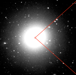 In the central region of galaxies, stars are packed in very tightly as they orbit the core. For example, if our solar system was located in the central region of the Milky Way, our night sky would be 90,000 brighter than it is out here on the rim where we live. Yet even these packed-in stars are so far away from us that they can't be picked out individually--all together they look like fluffy fuzz. So when we send the light of these packed-in stars through a prism, their spectra add together. So a spectrum of this starlight is a measure of the group speed of stars. When measured at different distances around a galaxy's core, we learn how the speed of these stars changes with distance from the center. By measuring the orbital speed of stars we are essentially weighing the mass inside their orbit around the center. This is how we weigh the sun, too. HST measured the velocity of stars inside the rectangle, centered on the core of M84. |