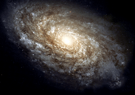 But since our solar system is located in the plane of the Galaxy, our view of it is edge-on. From far away, it would look like this galaxy, above, with dark lanes of dust and gas, obscuring the light from the inner regions.