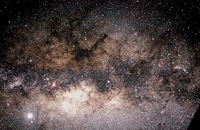 This picture shows our view in the direction of the constellations Sagittarius, in the direction of the central core of our Galaxy. Our view of the Galactic Center is hidden by gas, dust and tightly packed stars. If you were to fly off in this direction at the speed of light, in 30 thousand years you would arrive at the central hub of the Milky Way. Since a trip isn't exactly practical, how can we know if a black hole lurks there if we can't see the center?