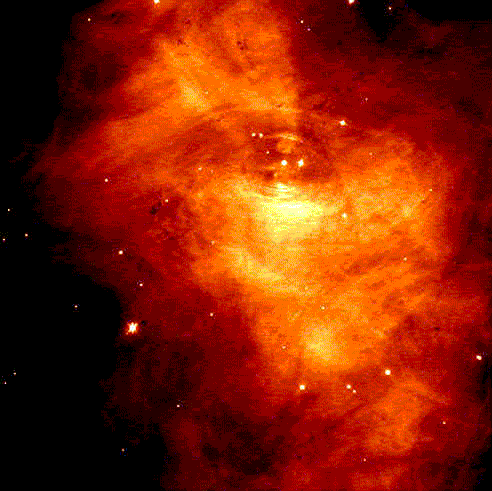 Modern research telescopes do not use film! They use computers with light detectors that are only sensitive to the number of photons that strike, just like our b&w eye cells that respond to intensity and not color. Modern cameras on telescopes don't care about the wavelength or color coming from the object, but only on the number of photons. Then the computer translates the intensity of light into shades of gray. On top is a visible-light image of the inner region of the Crab nebula taken by HST and displayed in shades of gray. However, the astronomer might prefer to look at a FALSE COLOR image, or a negative image instead of black & white. Sometimes color can be used to bring out faint features. |