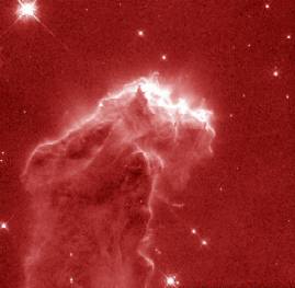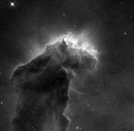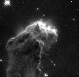 So, to obtain a true color image in astronomy, you have to take three (black & white) exposures, each one with a different color filter. Of course, this means taking three different images of the same object. Here are 3 images of the eagle nebula each taken with a different color filter, blue, green, and red. The computer records only the intensity of each image (black & white), and later colors each b&w image by the color of the filter used (shown on the far right). |